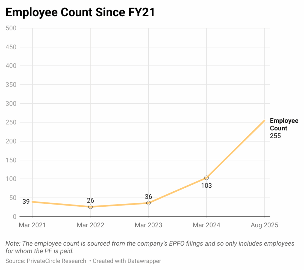 From 39 employees in Mar 2021 to 255 employees in Aug 2025, the company has grown 6.5x in just four years, a strong indicator of scale-up momentum.
