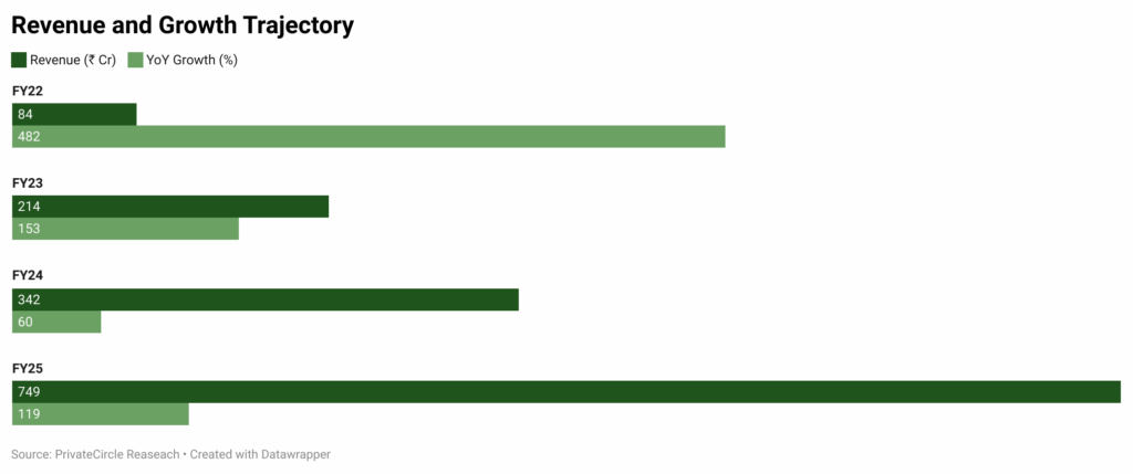 FY22 – Breakout Phase: Revenue jumped to ₹84.33 Cr, driven by fast adoption and strong product-market fit, leading to an explosive 482% YoY growth.