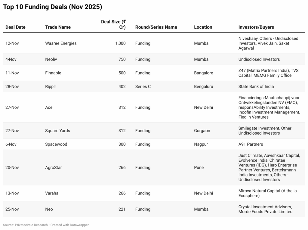 Nov 2025 proved that India’s private market is on a strong upward trajectory. From clean energy and climate tech to digital lending and consumer ecosystems, investors are choosing sectors that combine scalability, sustainability, and strong financial discipline.